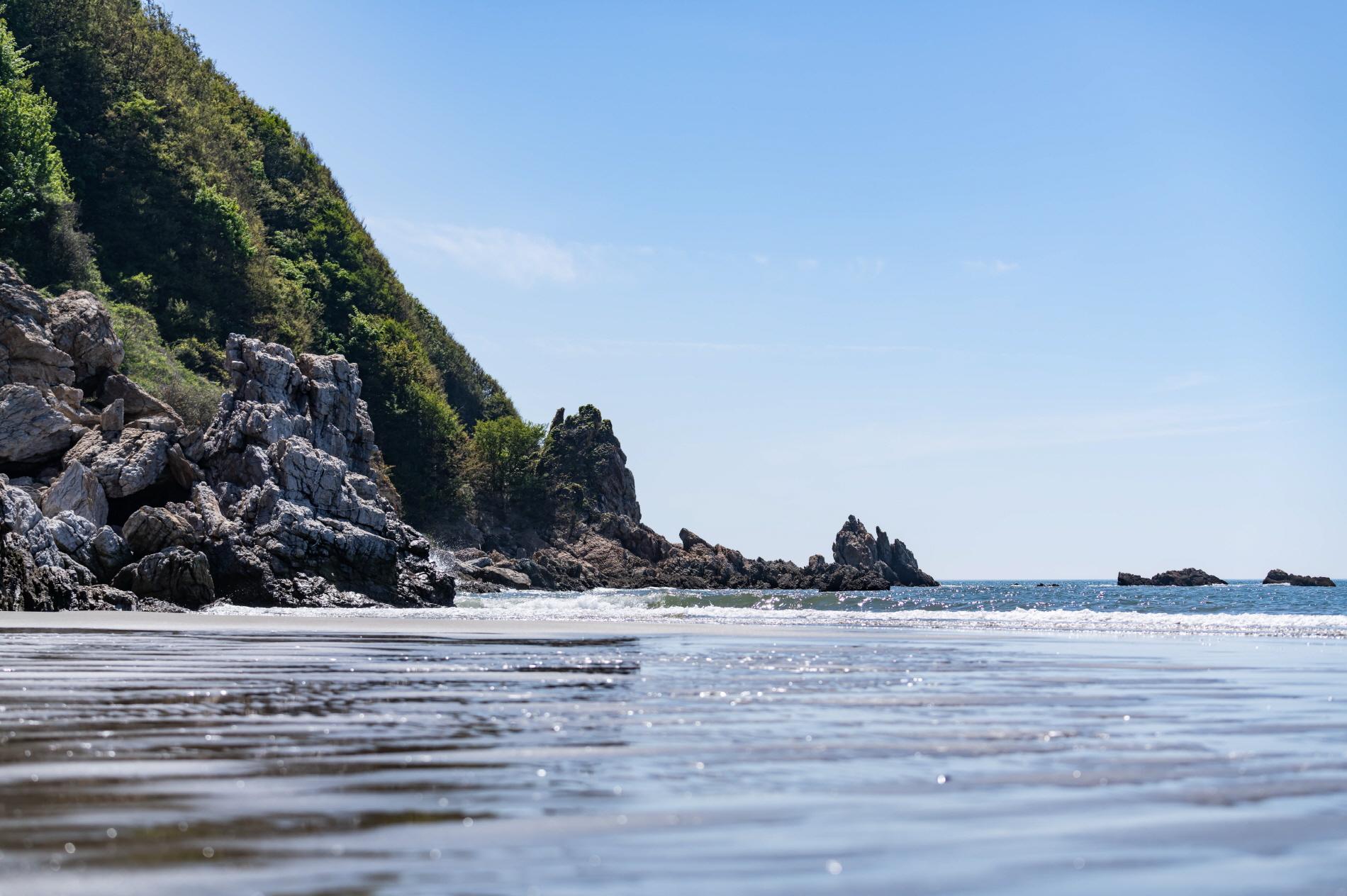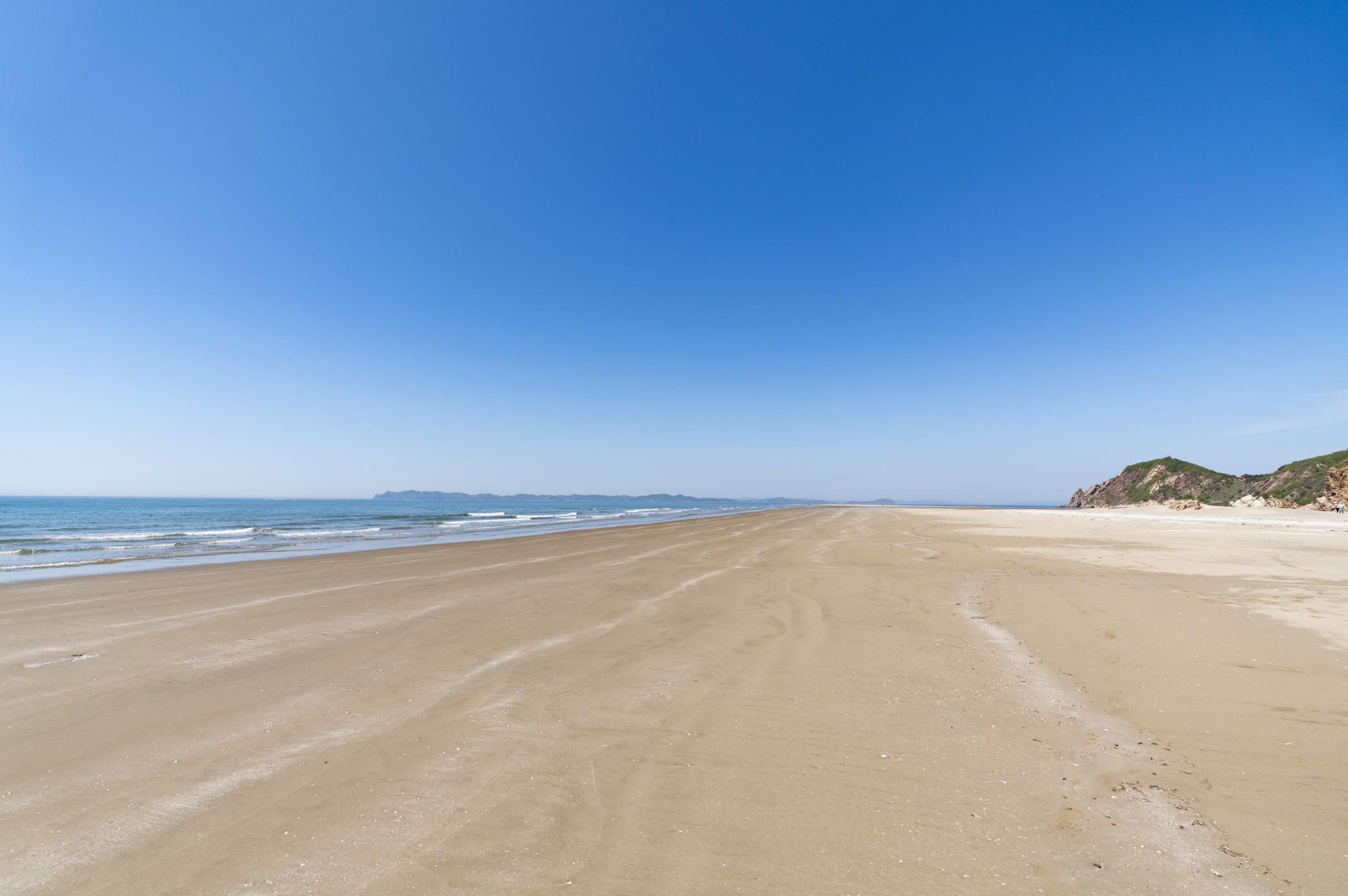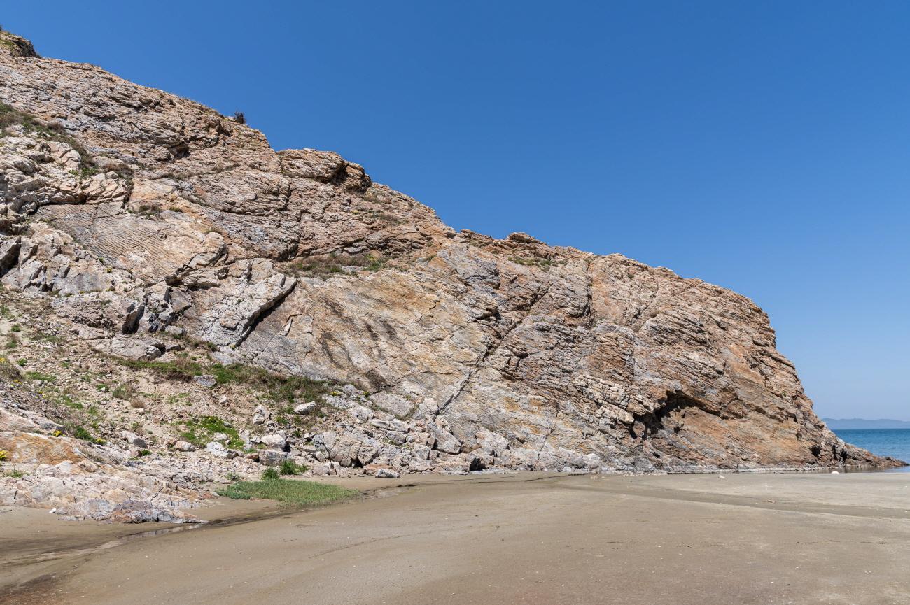 물이 빠지면 광활한 모래사장이 생김, 모래에 생긴 물결모양과 비슷한 바위의 흔적이 있다.
